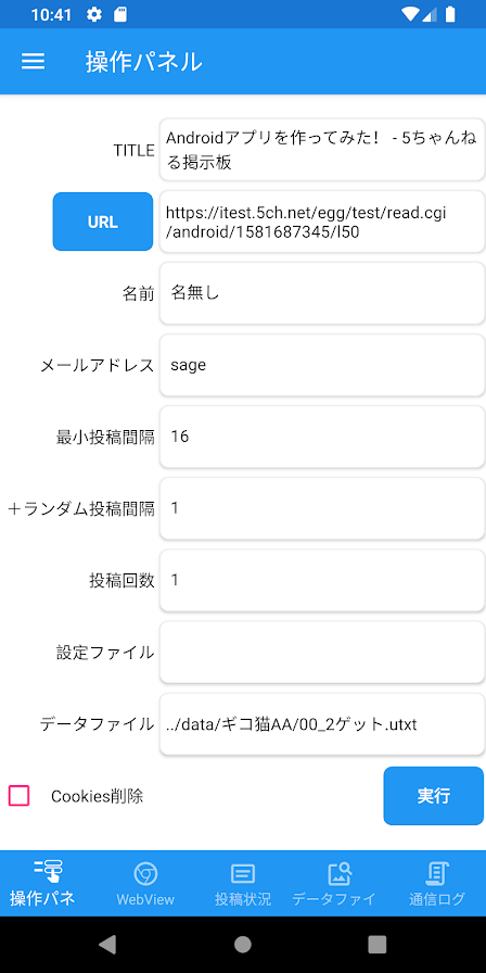 アプリ内にWEBブラウザ、操作パネルなどがあり、操作パネルに5chのスレのURL、名前、メールアドレス、投稿間隔、投稿回数、およびデータファイル(コメント欄に入力するテキストファイル)などを設定して投稿します。